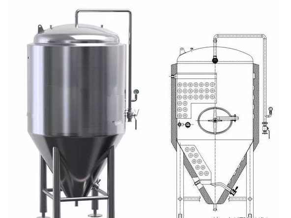 (1)底部為錐形便于生產(chǎn)過程中隨時排放酵母,要求采用凝聚性酵母。圓錐底的夾角一般為60o~80o,也有90o~110o,但這多用于大容量的發(fā)酵罐。發(fā)酵罐的圓錐底高度與夾角有關(guān),夾角越小錐底部分越高。一般罐的錐底高度占總高度的1/4左右,不要超過1/3。圓錐底的外壁應(yīng)設(shè)冷卻層,以冷卻錐底沉淀的酵母。錐底還應(yīng)安裝進排污口、出酒口、溫度傳感、制冷夾套等。罐的直徑與高度比通常為1:2~1:4,不能太高,以免引起強烈對流,影響酵母和凝固物的沉降